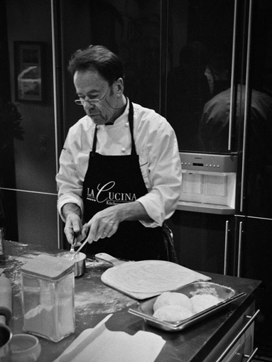 Ich pflege gerne eine offene Küche. Die Freunde sollen ruhig mitkochen. Das Menu ist klassisch: Vorspeise – Suppe – Fisch – Fleisch – Dessert.